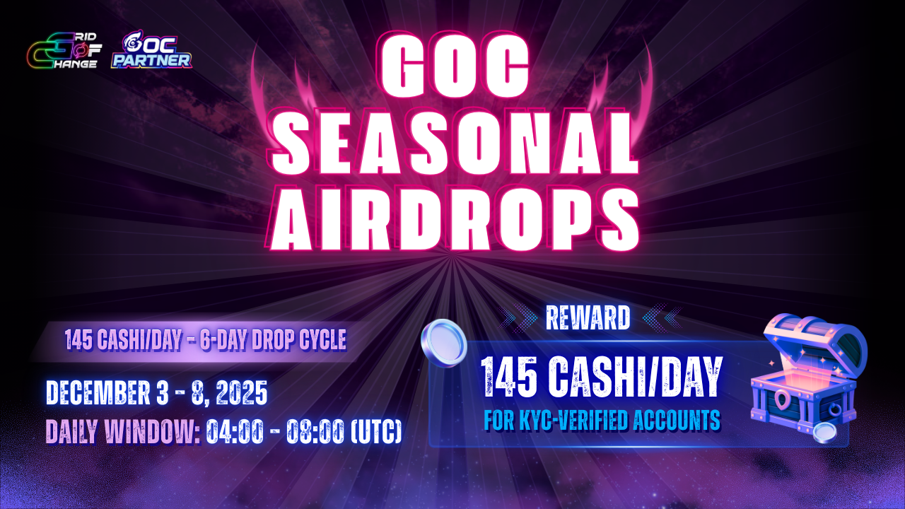 The GRID ecosystem continues its seasonal reward cycle with a new chapter of the GOC Seasonal Airdrops. Claim 145 CASHI per day for KYC-verified accounts. Below are the full details for this cycle, running for six days. 1. Event Period From December 3, 2025 to December 8, 2025Daily registration window: 04:00 UTC – 08:00 UTC […]