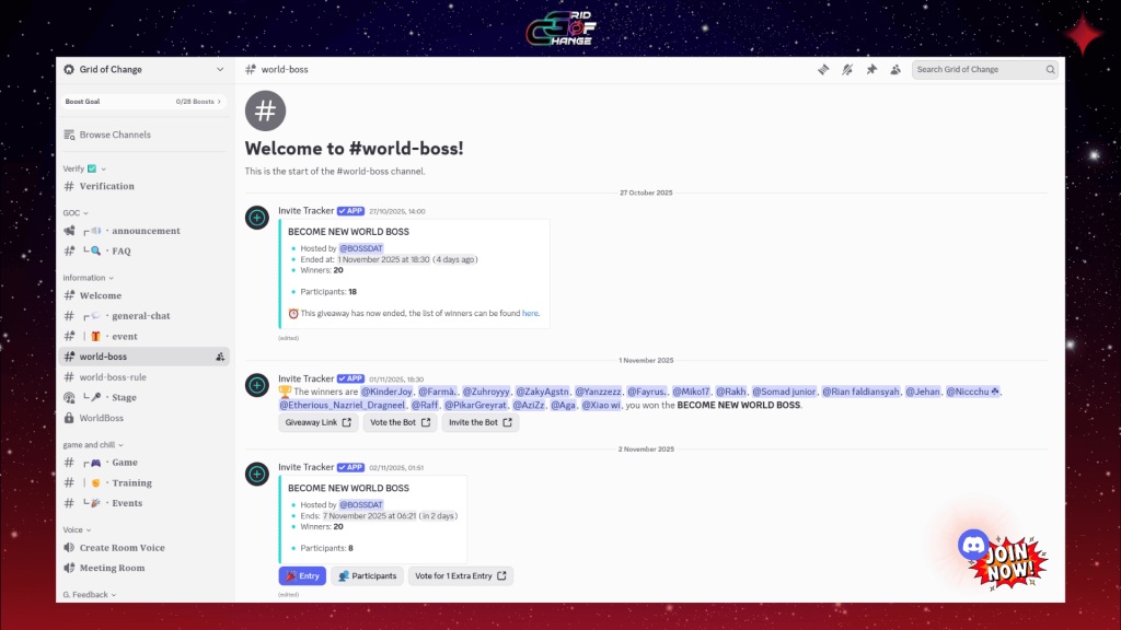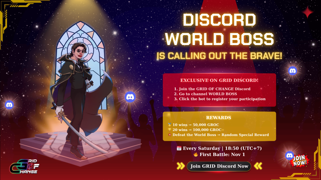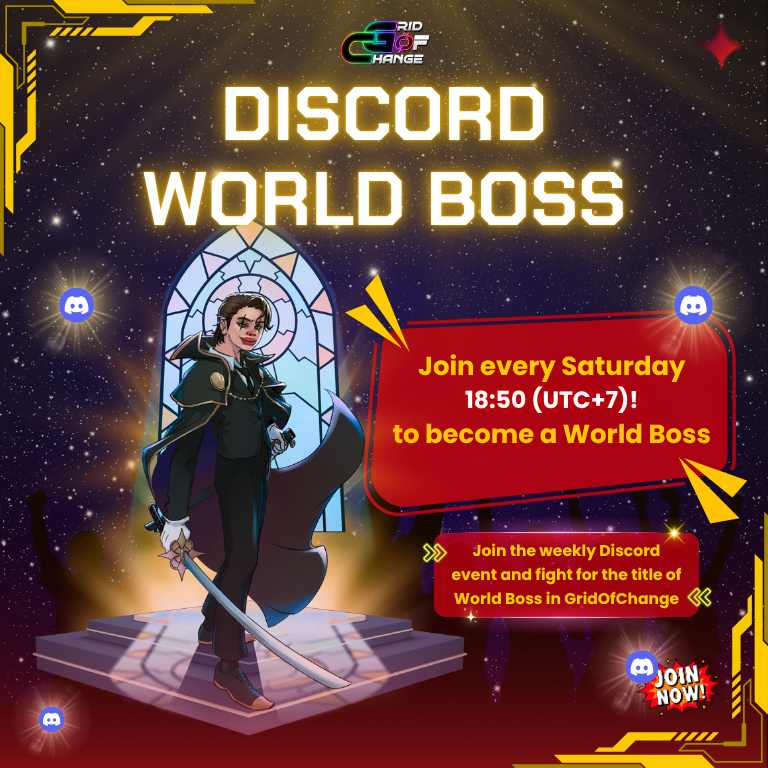The World Boss returns every week on the official GridOfChange Discord. Join the fight, prove your power, and earn real rewards. Anyone can become the next World Boss.