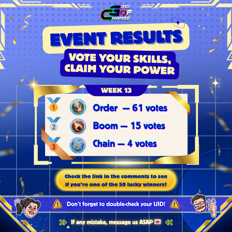 The weekly voting round has concluded, and the GRID community has selected its top skills once again. Below are the official results and the list of players who will receive this week’s rewards.