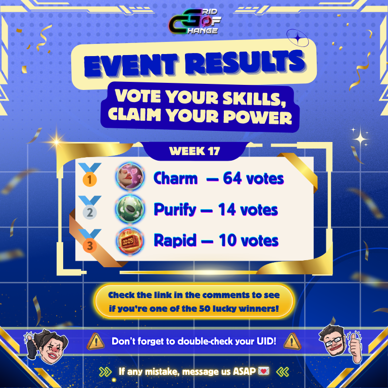 The weekly voting round has concluded, and the GRID community has selected its top skills once again. Below are the official results and the list of players who will receive this week’s rewards.