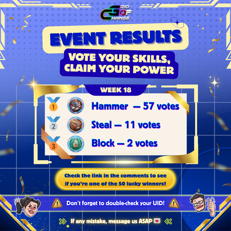 The weekly voting round has concluded, and the GRID community has selected its top skills once again. Below are the official results and the list of players who will receive this week’s rewards.