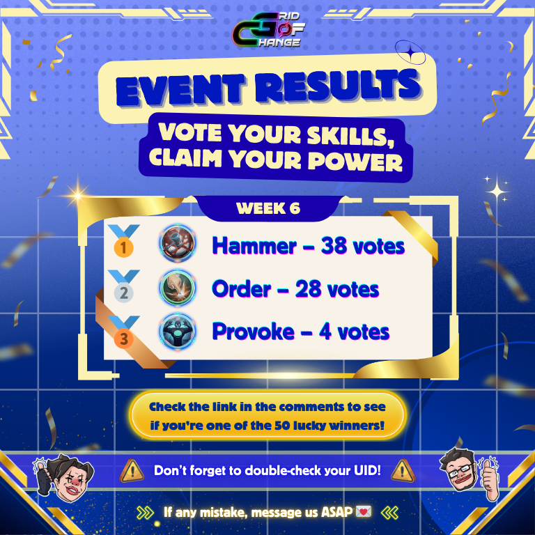 The weekly voting round has concluded, and the GRID community has selected its top skills once again. Below are the official results and the list of players who will receive this week’s rewards.